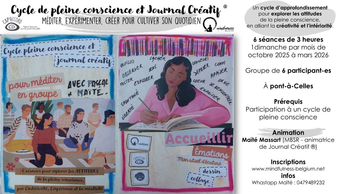 Concrètement, par des méditations guidées, par des approches expérientielles et en utilisant la méthode du journal créatif ®, différents aspects de la pleine conscience seront abordés...Une façon unique, variée et ludique de se l'approprier au quotidien.